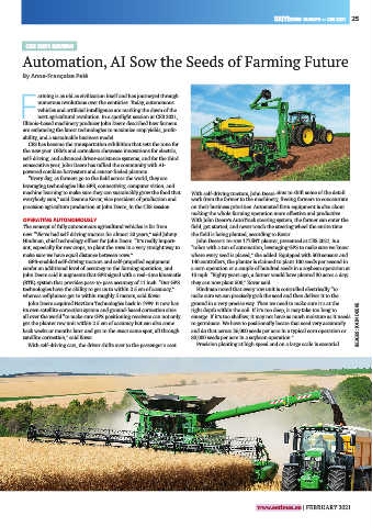 OPERATING AUTONOMOUSLY With John Deere’s AutoTrack steering system, the farmer can enter the