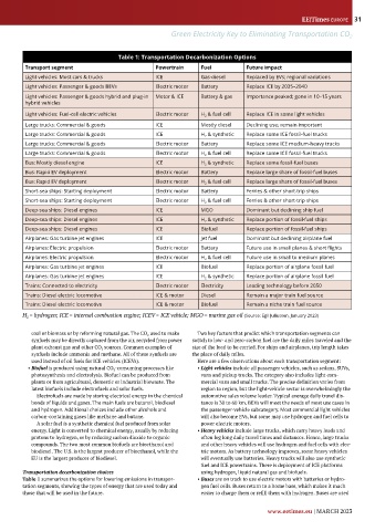 Table 1 summarizes the options for lowering emissions in transpor- • Buses are on track to use electric motors with batteries or hydro-