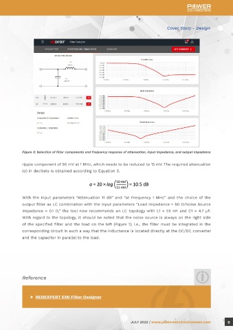 35 dB at 350 kHz, the tool recommends a CL circuit (Figure 2) and determines the values of the Figure 3: Selection of filter components and frequency response of attenuation, input impedance, and output impedance