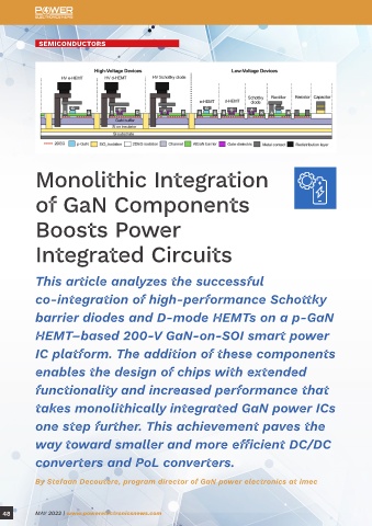 co-integration of high-performance Schottky Schematic cross-section of imec’s 200-V GaN-on-SOI power IC technology and components. The process features